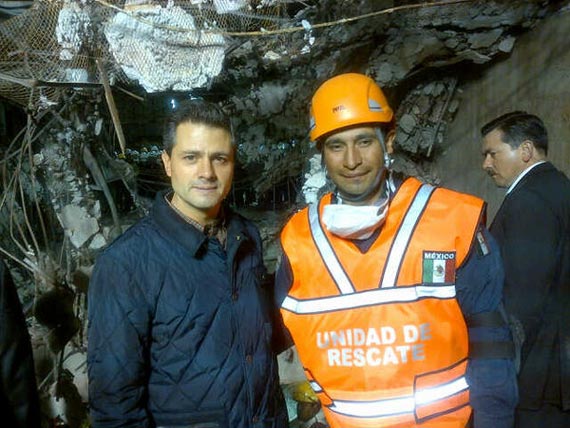 De manera inusual, por medio de la cuenta de Twitter de Pemex se informó de su intempestiva llegada a la Torre de Pemex la noche del sábado. Él mismo difundió desde su cuenta una foto para dejar testimonio.. Más tarde, informó desde @EPN: “Desafortunadamente, me informan que entre los escombros se ha rescatado un cuerpo más sin vida”.